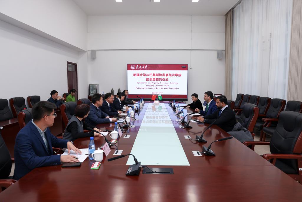 10月17日下午,新疆大学与巴基斯坦发展经济学院座谈暨签约仪式在新疆大学博达校区举行。新疆大学党委副书记、校长马新宾,巴基斯坦发展经济学院副校长穆罕默德·纳迪姆·贾维德代表双方签署合作备忘录并讲话。签约仪式由新疆大学党委常委、副校长刘正江主持。