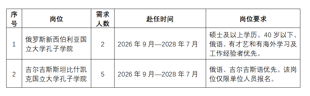 新疆大学在海外建设有3所孔子学院,分别为俄罗斯新西伯利亚国立大学孔子学院,吉尔吉斯斯坦比什凯克国立大学孔子学院和贾拉拉巴德国立大学孔子学院。为满足孔子学院发展需求,现公开招募2026年孔子学院国际中文教师。具体工作通知如下: